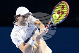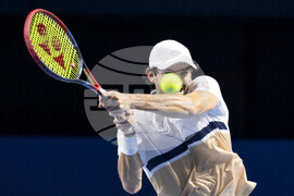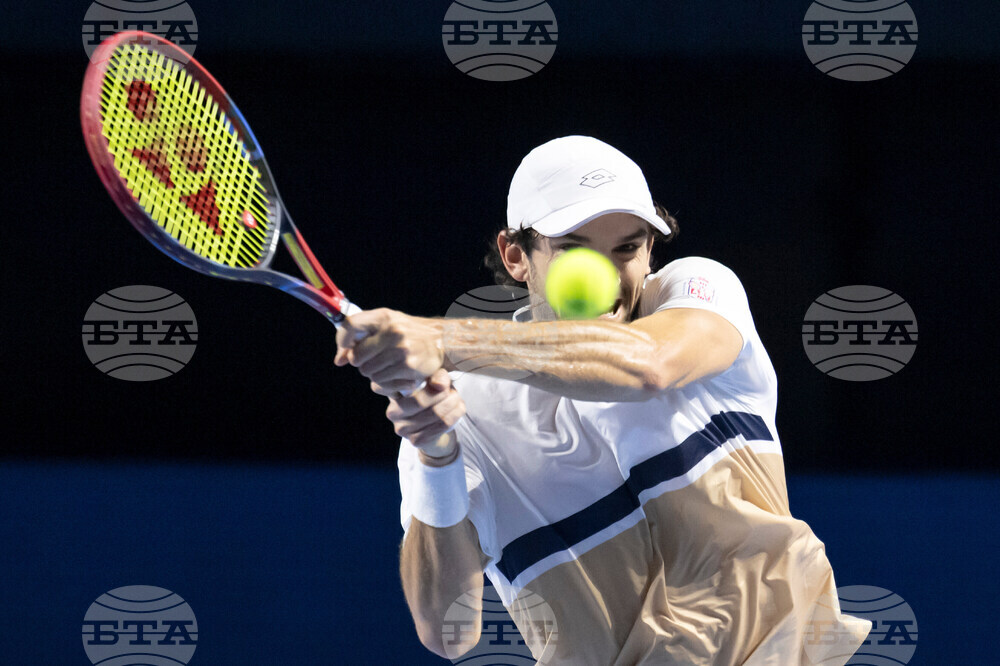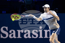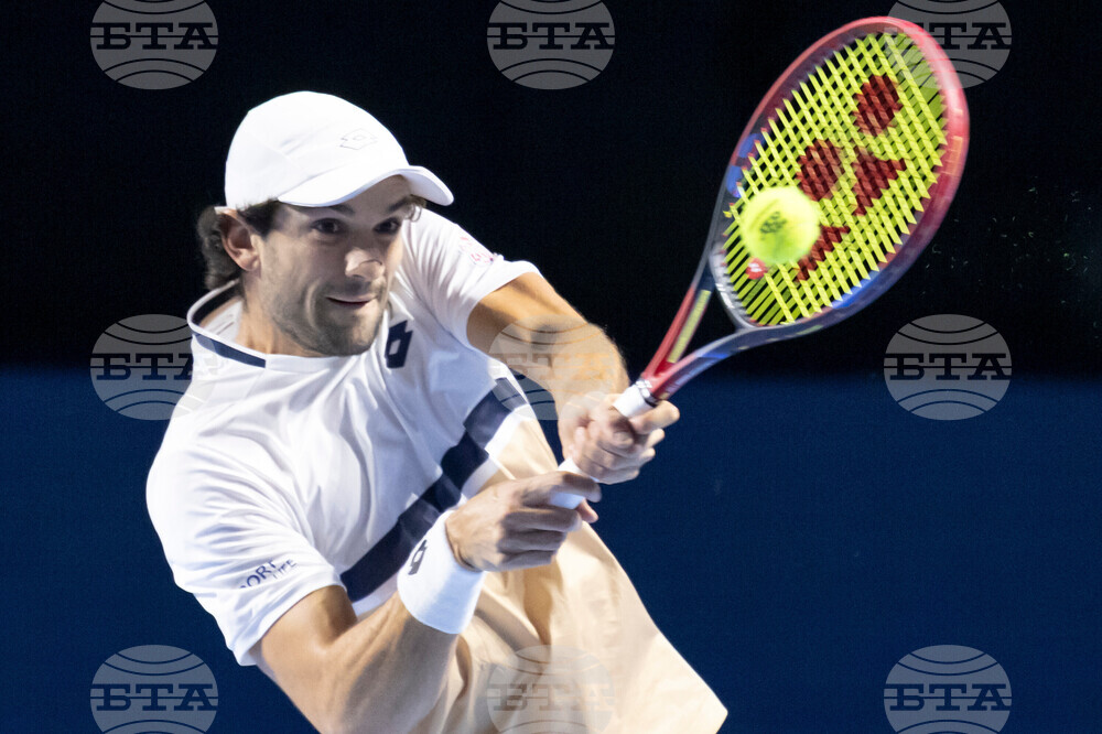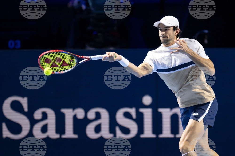 Taylor Fritz of the U.S. returns a ball to Monaco's Valentin Vacherot during their first round match at the Swiss Indoors tennis tournament at the St. Jakobshalle in Basel, Switzerland, Wednesday, Oct. 22, 2025. (Georgios Kefalas/Keystone via AP)