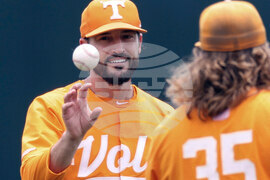 FILE - Tennessee head coach Tony Vitello, left, talks with pitcher Kirby Connell before an NCAA college baseball super regional game against Notre Dame, June 11, 2022, in Knoxville, Tenn. (AP Photo/Randy Sartin, File)