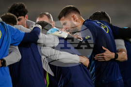 Tottenham's goalkeeper Guglielmo Vicario, right, huddles with teammates as he warms-up before a Champions League opening phase soccer match between Monaco and Tottenham Hotspur in Monaco, Wednesday, Oct. 22, 2025. (AP Photo/Philippe Magoni)