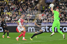 Monaco's goalkeeper Philipp Koehn tries to claim the ball during a Champions League opening phase soccer match between Monaco and Tottenham Hotspur in Monaco, Wednesday, Oct. 22, 2025. (AP Photo/Philippe Magoni)