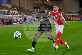 Tottenham's Mohammed Kudus passes the ball challenged by Monaco's Kassoum Ouattara during a Champions League opening phase soccer match between Monaco and Tottenham Hotspur in Monaco, Wednesday, Oct. 22, 2025. (AP Photo/Philippe Magoni)