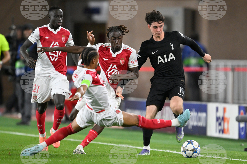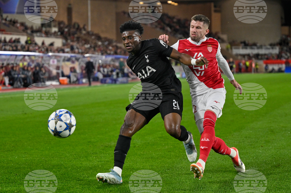 Tottenham's Mohammed Kudus, left, holds off Monaco's Caio Henrique during a Champions League opening phase soccer match between Monaco and Tottenham Hotspur in Monaco, Wednesday, Oct. 22, 2025. (AP Photo/Philippe Magoni)