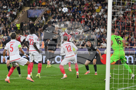 Tottenham's Kevin Danso, center, heads the ball during a Champions League opening phase soccer match between Monaco and Tottenham Hotspur in Monaco, Wednesday, Oct. 22, 2025. (AP Photo/Philippe Magoni)
