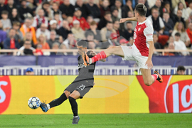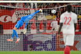 Monaco's goalkeeper Philipp Koehn saves the ball in front of Tottenham's Richarlison during a Champions League opening phase soccer match between Monaco and Tottenham Hotspur in Monaco, Wednesday, Oct. 22, 2025. (AP Photo/Philippe Magoni)