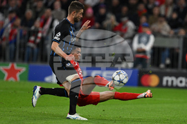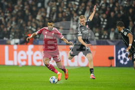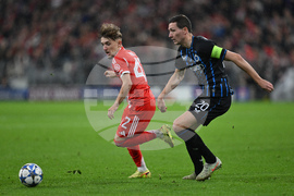 Bayern Munich's Lennart Karl, left, and Bruges' Hans Vanaken during the Champions League soccer match between Bayern Munich and FC Brugge in Munich, Germany, Wednesday Oct. 22, 2025. (Sven Hoppe/dpa via AP)