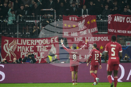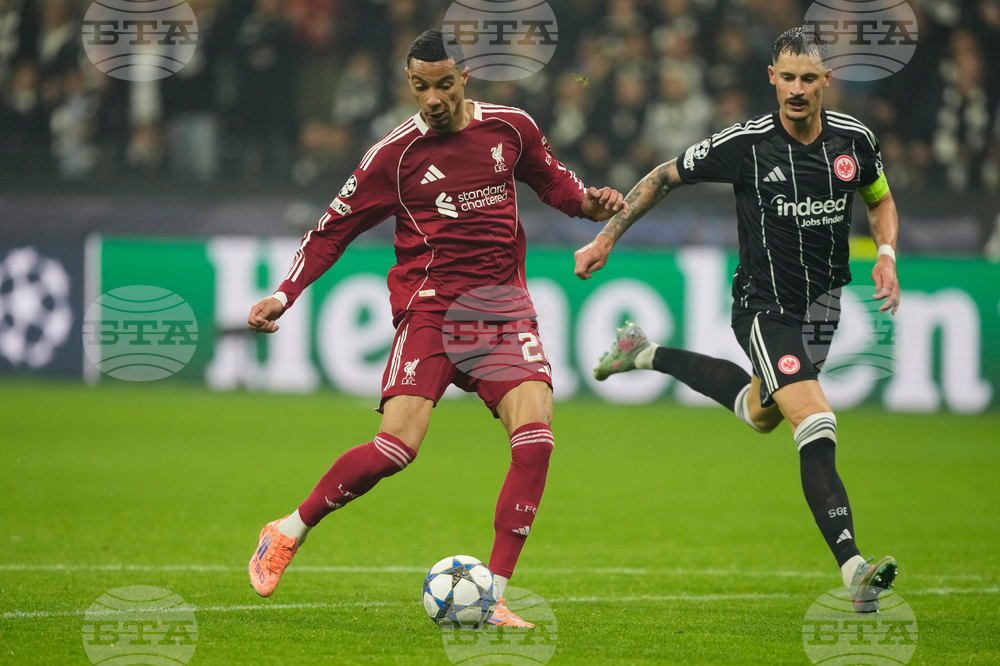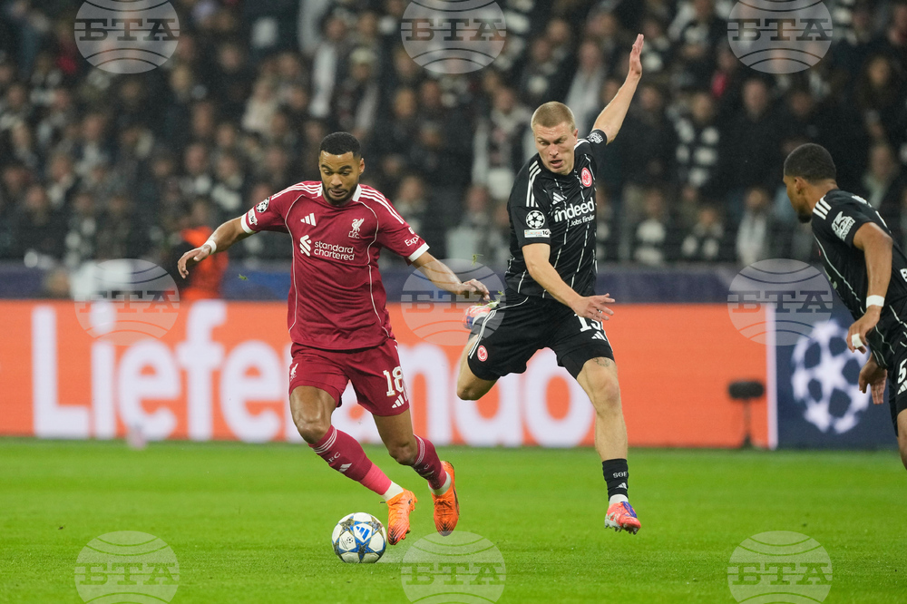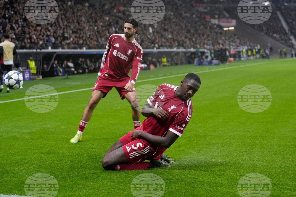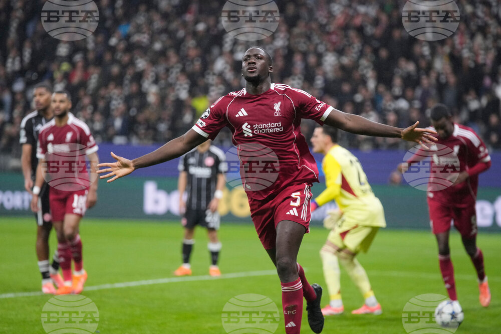 Liverpool's Ibrahima Konate, third from left, scores his side's third goal during the Champions League opening phase soccer match between Eintracht Frankfurt and Liverpool in Frankfurt, Germany, Wednesday, Oct. 22, 2025. (AP Photo/Michael Probst)