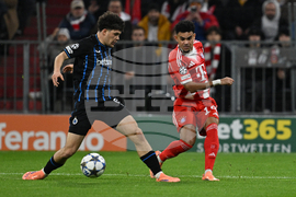 Bruges' Brandon Mechele, left, and Bayern Munich's Luis Diaz in action during the Champions League soccer match between Bayern Munich and FC Brugge in Munich, Germany, Wednesday Oct. 22, 2025. (Sven Hoppe/dpa via AP)