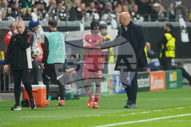 Liverpool's manager Arne Slot, right, shales hands with Jeremie Frimpong during a substitution at the Champions League opening phase soccer match between Eintracht Frankfurt and Liverpool in Frankfurt, Germany, Wednesday, Oct. 22, 2025. (AP Photo/Michael Probst)