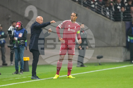 Liverpool's manager Arne Slot, left, talks to Virgil van Dijk during the Champions League opening phase soccer match between Eintracht Frankfurt and Liverpool in Frankfurt, Germany, Wednesday, Oct. 22, 2025. (AP Photo/Michael Probst)