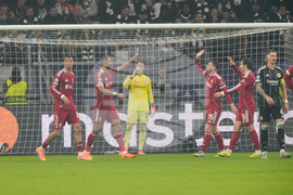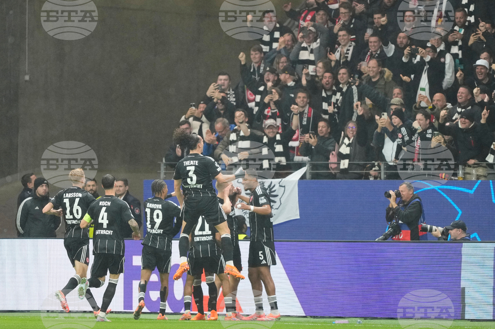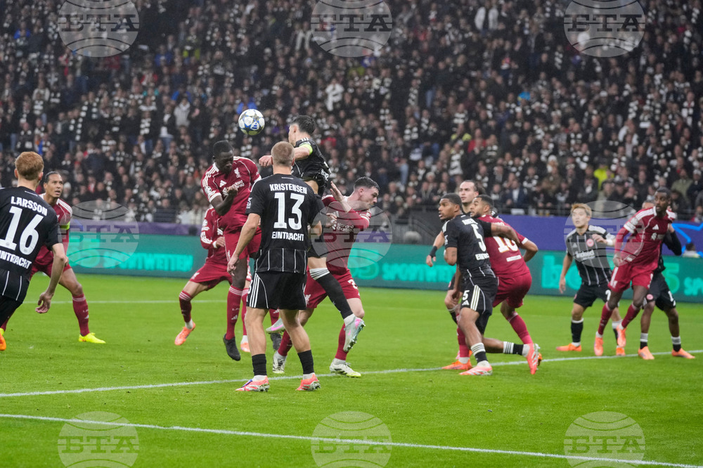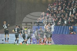 Frankfurt's players celebrate after Rasmus Kristensen scored the opening goal during the Champions League opening phase soccer match between Eintracht Frankfurt and Liverpool in Frankfurt, Germany, Wednesday, Oct. 22, 2025. (AP Photo/Michael Probst)