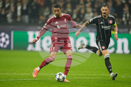 Liverpool's Cody Gakpo, left, and Frankfurt's Rasmus Kristensen challenge for the ball during the Champions League opening phase soccer match between Eintracht Frankfurt and Liverpool in Frankfurt, Germany, Wednesday, Oct. 22, 2025. (AP Photo/Michael Probst)