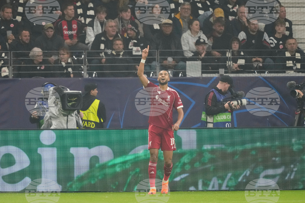 Liverpool's Cody Gakpo celebrates after scoring his side's fourth goal during the Champions League opening phase soccer match between Eintracht Frankfurt and Liverpool in Frankfurt, Germany, Wednesday, Oct. 22, 2025. (AP Photo/Michael Probst)