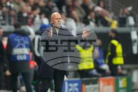 Liverpool's manager Arne Slot gestures during the Champions League opening phase soccer match between Eintracht Frankfurt and Liverpool in Frankfurt, Germany, Wednesday, Oct. 22, 2025. (AP Photo/Michael Probst)
