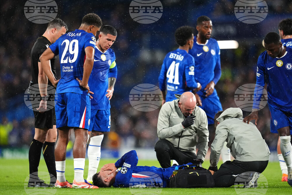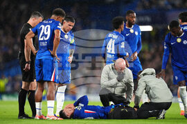 Chelsea's Facundo Buonanotte receives treatment after a challenge by Ajax's Kenneth Taylor, not pictured, which results in a red card to the Ajax player during the UEFA Champions League match between Chelsea and Ajax, in London, Wednesday Oct. 22, 2025. (Adam Davy/PA via AP)