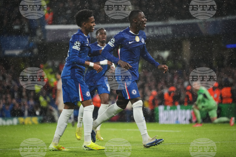Chelsea players celebrate after a goal during the UEFA Champions League soccer match between Chelsea and Ajax in London Wednesday, Oct. 22, 2025. (AP Photo/Alastair Grant)