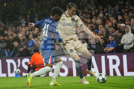 Chelsea's Facundo Buonanotte, left, and Ajax's Raul Moro fight for the ball during the UEFA Champions League soccer match between Chelsea and Ajax in London Wednesday, Oct. 22, 2025. (AP Photo/Alastair Grant)