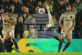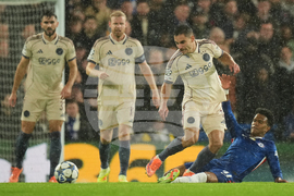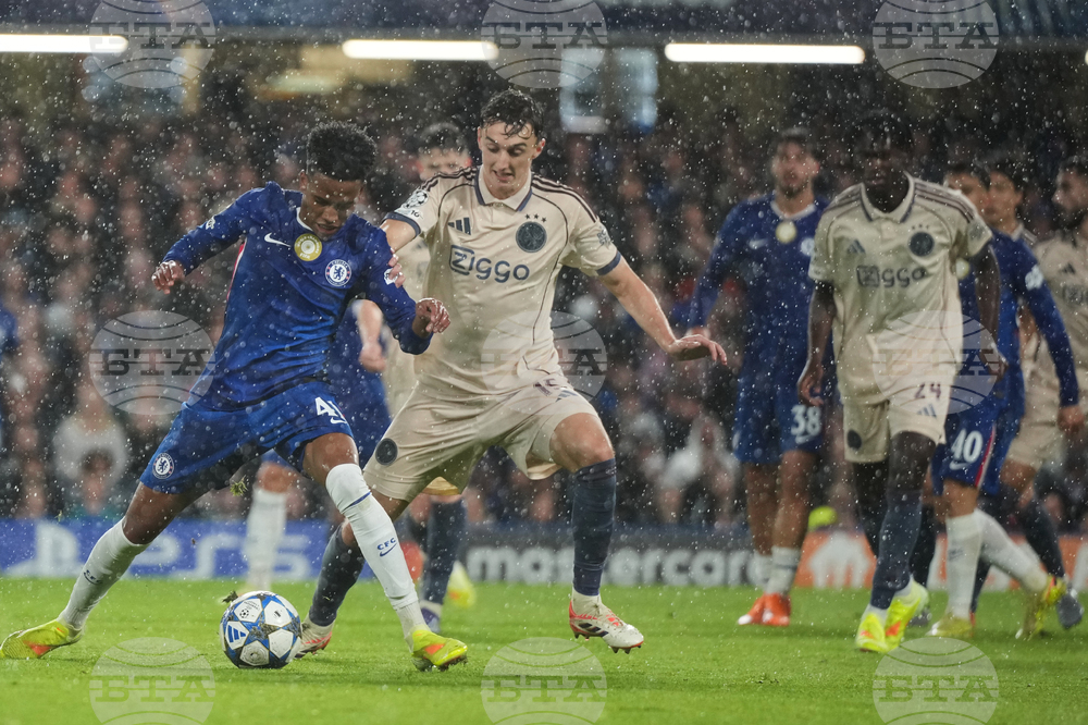 -aj454- tackles Chelsea's Facundo Buonanotte during the UEFA Champions League soccer match between Chelsea and Ajax in London Wednesday, Oct. 22, 2025. (AP Photo/Alastair Grant)