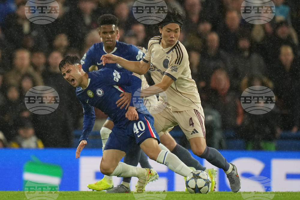 Chelsea's Andrey Santos fouls Ajax's Ko Itakura during the UEFA Champions League soccer match between Chelsea and Ajax in London Wednesday, Oct. 22, 2025. (AP Photo/Alastair Grant)