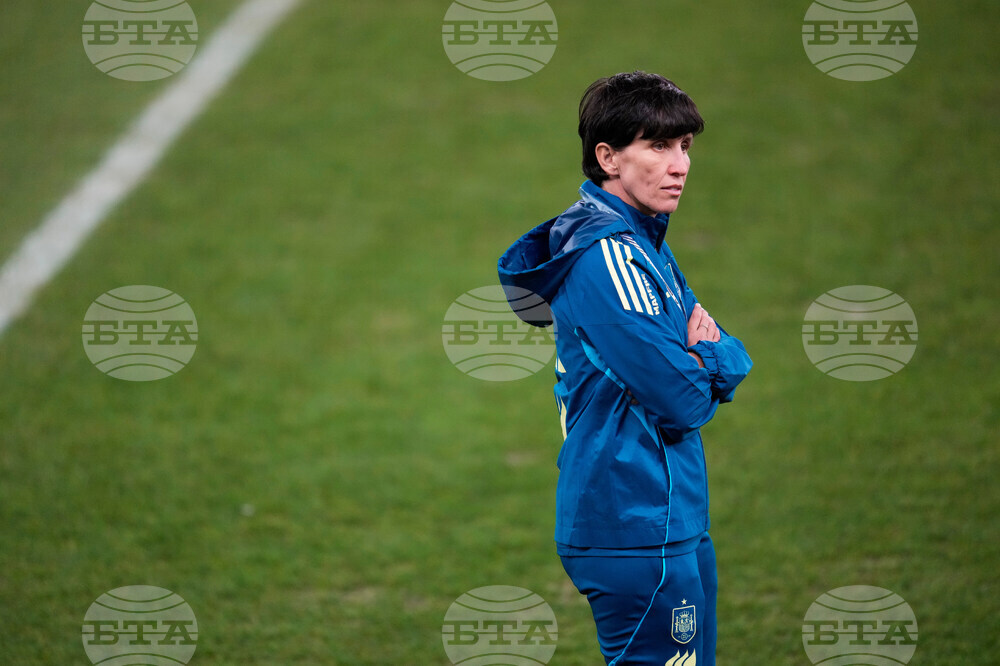 Spain's national team head coach Sonia Bermúdez Tribano looks on during a training session ahead of their Nation's League semi-final against Sweden, in Gothenburg, Sweden, Monday Oct. 27, 2025. (Björn Larsson Rosvall/TT News Agency via AP)