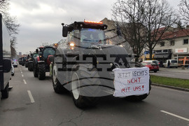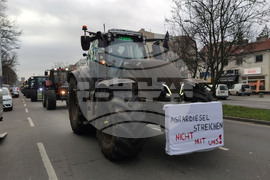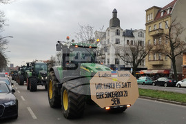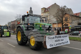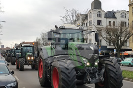 Берлин (18 декември 2023) Земеделски производители с трактори участват в протестен митинг, организиран от „Германски фермери" в Берлин. Те протестират срещу планирани съкращения на данъчни облекчения за дизеловото гориво, използвано в селското стопанство. На снимката: Стотици тежки машини преминават по булевард в района на Темпелхоф на път за централната част на Берлин.