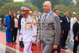 Ханой (6 януари 2024) Церемония по полагане на венец пред Паметника на героите и мъчениците се състои в Ханой. На снимката: председателят на Народното събрание Росен Желязков (дясно).
