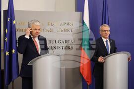 София (15 февруари 2024) В Министерски съвет се провежда брифинг след срещата на премиера Николай Денков (ляво) с европейския комисар по правосъдие Дидие Рейндерс (дясно).