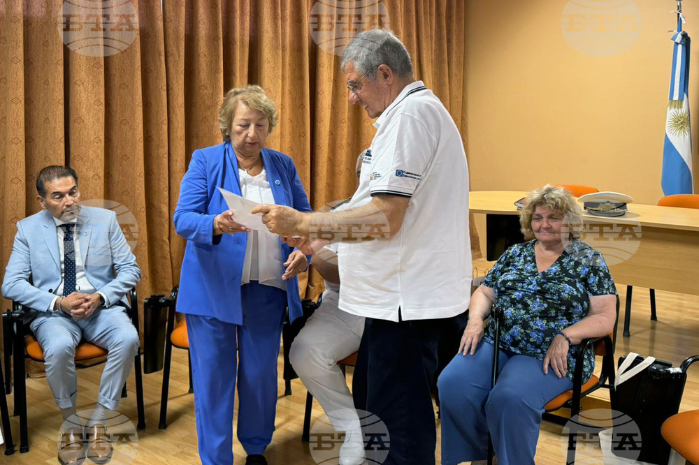 Комодоро Ривадавия (18 февруари 2024) Ръководителят на 32-та българска антарктическа експедиция проф. Христо Пимпирев предаде писма от кмета на Бургас и ректора на Софийския университет “Св. Климент Охридски” с предложения за партньорство на аржентинския град Комодоро Ривадавия, в който има около 2 000 потомци на преселили се преди век българи. Заедно с група от експедицията той пристигна в най-големия град на провинция Чубут в Патагония с българския военен научноизследователски кораб “Св. св. Кирил и Методий”, който се прибира към България от българската база на остров Ливингстън в Антарктида. Кметът на Комодоро Ривадавия Отар Макарашвили върна писмо до бургаския кмет, с което приема предложението за партньорство и за предприемане на следващи стъпки за побратимяване на двата града. Той подписа писмото по време на среща на българските антарктици и екипажа с българската общност в центъра на дружеството й, което носи същото име като кораба - “Св. св. Кирил и Методий”. Ректорът на Националния университет на Патагония “Сан Хуан Боско” проф. Лидия Бланко също прие предложението за партньорство със Софийския университет. Срещи с представители на кметството и управата на провинция Чубут имаше част от групата на експедицията, в която влизат и посланикът на България в Аржентина Стоян Михайлов, ректорът на Висшето военноморско училище (ВВМУ) - Варна флотилен адмирал проф. д.в.н. Боян Медникаров, генералният директор на Българската телеграфна агенция (БТА) Кирил Вълчев (в средата) и др. На снимката: председател на Аржентино - българската фондация в Буенос Айрес, която представлява и учредената през 2022 г. Федерация на българските дружества в Аржентина Ружка Николова (дясно), председателят на българското дружество в Комодоро Ривадавия “Св. св. Кирил и Методий” Ценка Генова (ляво).