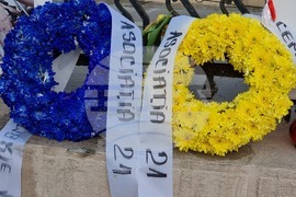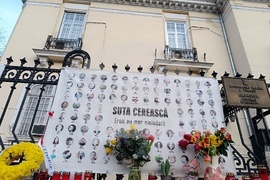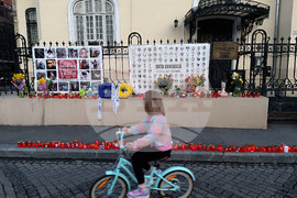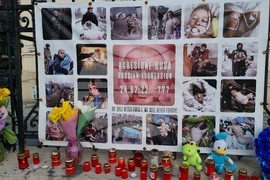Букурещ (24 февруари 2024) Украински граждани запалиха свещи и поднесоха венци пред сградата на посолството на Украйна в Букурещ, за да отбележат втората годишнина от пълномащабната руска инвазия в страната им. Те изложиха пред дипломатическото представителство плакати с надписи: „Русия не спазва Женевската конвенция“, „Русия уби повече от 500 украински деца“.