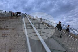 Тирана (25 февруари 2024) Ежедневие в центъра на столицата на Албания, Тирана. На снимката: Хора се изкачват по стълбите на Пирамидата