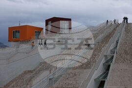 Тирана (25 февруари 2024) Ежедневие в центъра на столицата на Албания, Тирана. На снимката: Хора се изкачват по стълбите на Пирамидата.
