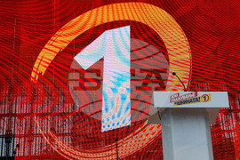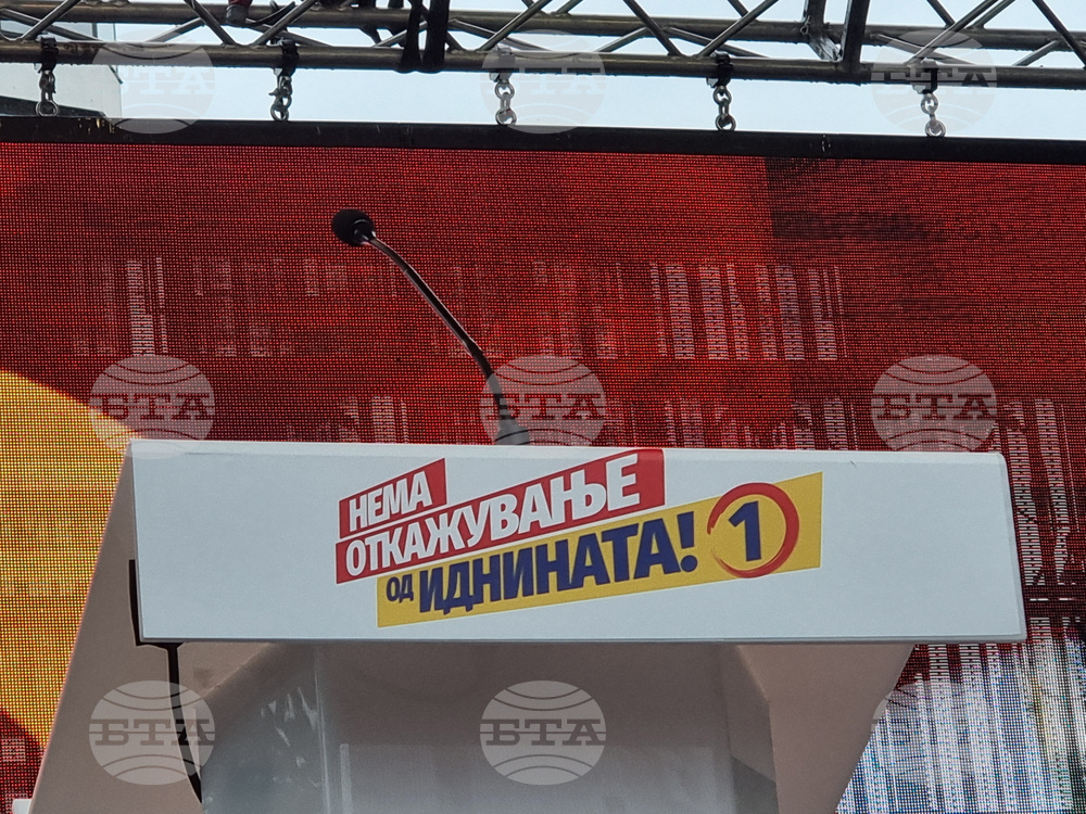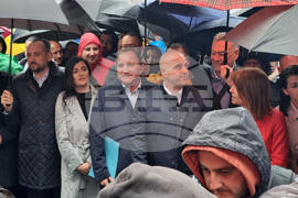 Скопие (21 април 2024) Пред сградата на Делегацията на ЕС в Скопие, СДСМ провежда митинг, на който присъства и председателят на Партията на европейските социалисти (ПЕС). Под проливния дъжд стотици симпатизанти на управляващата партия в Северна Македония затвориха улицата пред сградата, в предпоследния ден от предизборната кампания за президентските и петия ден от кампанията за парламентарните избори в страната.
