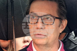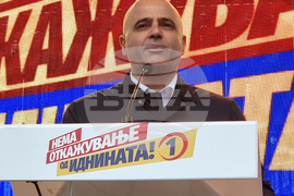 Скопие (21 април 2024) Пред сградата на Делегацията на ЕС в Скопие, СДСМ провежда митинг, на който присъства и председателят на Партията на европейските социалисти (ПЕС). Под проливния дъжд стотици симпатизанти на управляващата партия в Северна Македония затвориха улицата пред сградата, в предпоследния ден от предизборната кампания за президентските и петия ден от кампанията за парламентарните избори в страната. На снимката: председателят на СДСМ Димитър Ковачевски.