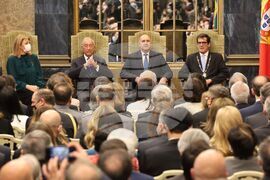 Порто(12 април 2022) След официалната церемония по посрещането, президентът Румен Радев, португалският му колега Марселo Ребелo де Соуза посетиха кметството на града. Кметът на Порто Руи Морейра (дясно) връчи на Румен Радев ключа на града. Пресфото-БТА снимка: Владимир Шоков (ЕД)