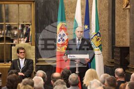 Порто(12 април 2022) След официалната церемония по посрещането, президентът Румен Радев (дясно), португалският му колега Марселo Ребелo де Соуза (втори отляво надясно) посетиха кметството на града. Българският президент е придружаван от неговата съпруга Десислава Радева. Те бяха посрешнати от кмета на Порто Руи Морейра (втори отдясно наляво).