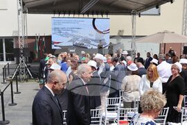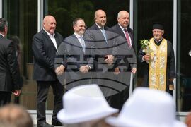 Двамата държавни глави откриха Българския културно-образователен център, изграден с подкрепата на българската и унгарската държава. В новата сграда се помещават образователните и културните институции и неправителствените организации на българската общност. На снимката: Председателят на Българското републиканско самоуправление в Унгария. д-р Данчо Мусев (втори отляво), президентът на България Румен Радев (в средата), президентът на Унгария Тамаш Шуйок (втори отдясно), отец Танчо (вдясно).
