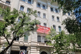 Будапеща (8 юни 2024) Унгарците могат да гласуват днес за евродепутати, за кметове и за представители на републиканските самоуправления на националните малцинства от 06:00 ч. до 19:00 часа. В страната има 10 119 избирателни секции, съобщи Националната избирателна комисия в Будапеща. На снимката: историческа сграда до площад „Свобода “, която се продава.