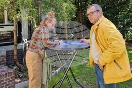 Хага - Утрехт (9 юни 2024) Българите в Нидерландия гласуват за Европарламент и Народно събрание в 24 секции, разположени в цялата страна. В 7 от тях има и машинно гласуване: едната е в Посолството в Хага, има две в Амстердам и по една Айндховен, Бреда, Ваалс и Ротердам. Пред секциите в Хага има опашки. Има хора, които предпочитат да изчакат, за да гласуват с машина. В Утрехт началото бе спокойно, като до 9,30 часа бяха гласували само членовете на секционната комисия в единствената избирателна секция в града. 761 българи са се регистрирали предварително за изборите за Европарламент в Нидерландия, а 778 – за Народно събрание. На снимката: гласоподаватели попълват декларации в двора на Българското посолство в Хага.