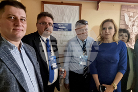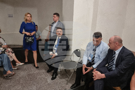 Одеса (19 юни 2024) Сигнал за въздушна тревога прекъсна концерта "Музикалните хитове на световното кино" в Одеския национален академичен театър за опера и балет, посетен от част от участниците в Деветата световна среща българските медии в Украйна. Част от българската делегация прекара в бомбоубежището около половин час, след отмяна на тревогата концертът продължи. На снимката (от ляво надясно): специалният пратеник на БТА в Одеса Николай Трифонов, генералният директор на БНР Милен Митев, генералният директор на БТА Кирил Вълчев, председателят на Съвета за електронни медии Габриела Наплатанова.