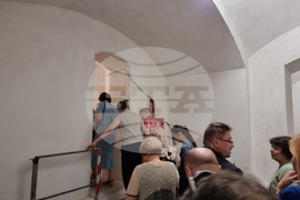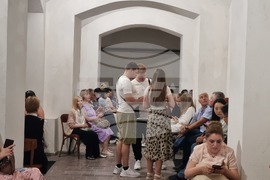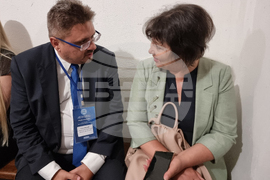 Одеса (19 юни 2024) Сигнал за въздушна тревога прекъсна концерта "Музикалните хитове на световното кино" в Одеския национален академичен театър за опера и балет, посетен от част от участниците в Деветата световна среща българските медии в Украйна. Част от българската делегация прекара в бомбоубежището около половин час, след отмяна на тревогата концертът продължи. На снимката (от ляво надясно): генералният директор на БТА Кирил Вълчев и заместник генералният директор на БТА Евгения Друмева.