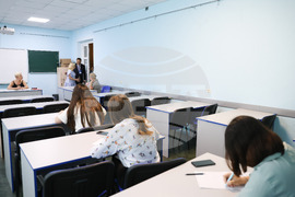 Измаил (21 юни 2024) Посрещане на участниците в деветнайстата Световна среща на българските медии в Измаилския държавен хуманитарен университет с хляб и сол по български обичай. Участниците разглеждат стаите на Българското неделно училище "Българска светлица". На снимката (от ляво надясно): председателят на българска община "Света София" Николай Иванов, ректорът на Софийския университет "Св. Климент Охридски" проф. Георги Вълчев, генералният консул на България в Одеса Светослав Иванов, генералният директор на БТА Кирил Вълчев.