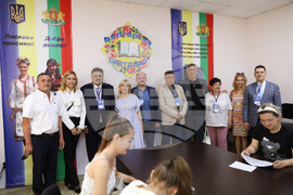 Измаил (21 юни 2024) Посрещане на участниците в деветнайстата Световна среща на българските медии в Измаилския държавен хуманитарен университет с хляб и сол по български обичай. Участниците разглеждат стаите на Българското неделно училище "Българска светлица". На снимката (от ляво надясно): председателят на българска община "Света София" Николай Иванов, председателят на Съвета за електронни медии Габриела Наплатанова, генералният директор на БТА Кирил Вълчев, директорът на българското неделно училище Светлана Кравченко, генералният консул на България в Одеса Светослав Иванов, генералният консул на България в Одеса Светослав Иванов, ректорът на Софийския университет "Св. Климент Охридски" проф. Георги Вълчев, ректорът на Измаилския държавен хуманитарен университет проф. д-р Ярослав Кичук, главният редактор на вестника на българите в Украйна „Роден край“, Украйна Дора Костова, програмният директор на радио Фокус Ива Дойчинова и генералният директор на БНР Милен Митев.
