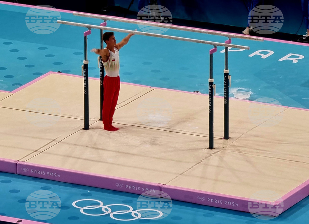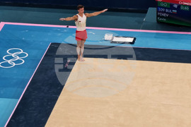 Париж (27 юли 2024) Кевин Пенев (България) в квалификациите на олимпийския турнир по спортна гимнастика.