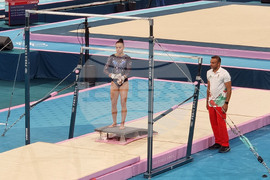 Париж (28 юли 2024) Навършващата 18 години днес Валентина Георгиева започна участието си в олимпийския турнир по спортна гимнастика в зала "Берси" в Париж. На снимката: Валентина Георгиева и нейният треньор Филип Янев.