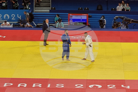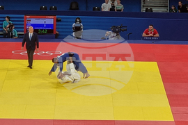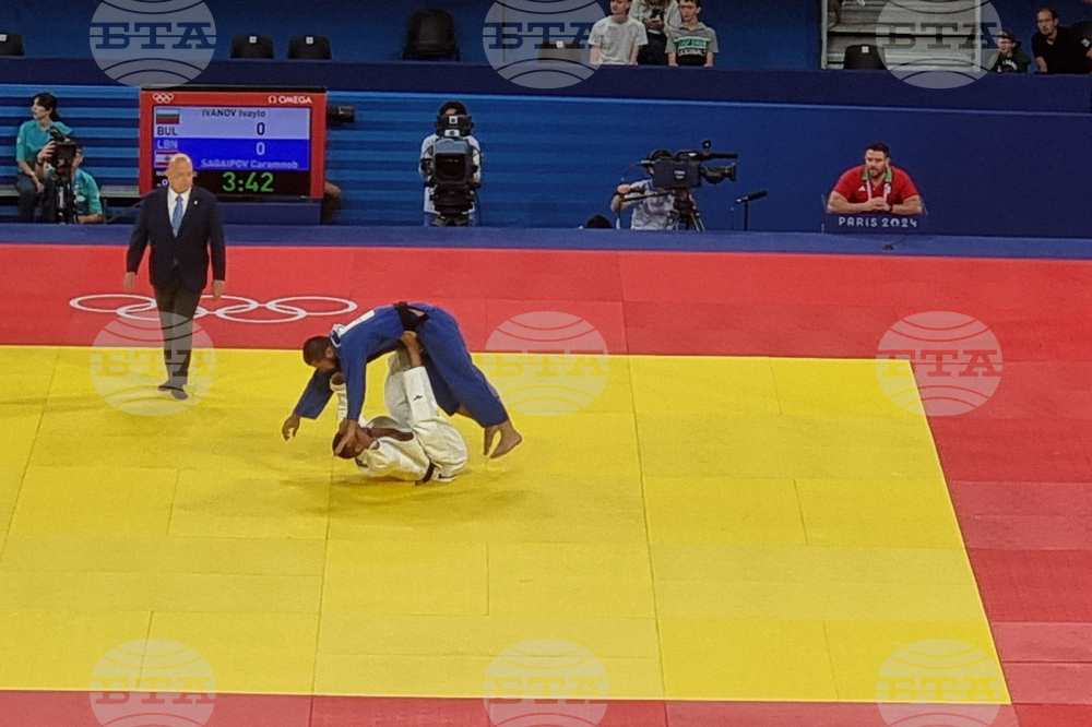 Париж (31 юли 2024) Ивайло Иванов (с бял екип) започна с победа над Карамноб Сагайпов (Ливан) в категория до 90 килограма на олимпийския турнир по джудо на Игрите в Париж 2024.