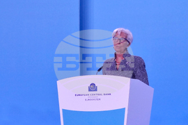 Франкфурт (12 септември 2024) Европейската централна банка отново понижи водещите си лихви, за втори път тази година. Регулаторът остави без промяна прогнозите си за инфлацията, но леко понижи очакванията за икономическия растеж. На снимката: пресконференция на председателя на ЕЦБ Кристин Лагард.
