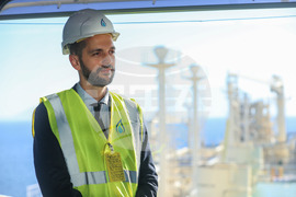 Александруполис (3 октомври 2024) Доставките на регазифициран природен газ от терминала до Александруполис са исторически момент за България и за целия регион. След едно решение, което взехме преди няколко години, днес получаваме реалната диверсификация на природния газ за България. Това е още един източник на газ, който прави нашата държава независима, а икономиката ни конкурента. Сега нашите домакинства могат да разчитат на топлина в домовете си, каза пред журналисти служебният министър на енергетиката Владимир Малинов на борда на терминала за регазификация на втечнен газ в морето близо до гръцкия град Александруполис. На снимктата: изпълнителният директор на "Булгартрансгаз" Кирил Равначки.