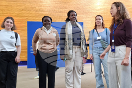 Страсбург (23 октомври 2024) Двадесет и три годишната австрийка Лена Шилинг (вдясно), която бе избрана през юни за евродепутат от групата на Зелените, доведе на пленарната сесия на Европейския парламент в Страсбурт млади активисти за климата от Уганда. Днес те провеждат фотоакция в кулоарите на институцията във френския град. Групата от 12 души развява плакати с надпис „Накарайте замърсителите да плащат” и „Адаптиране на финансирането сега” и скандираше „Обединени никога няма да бъдем победени”.