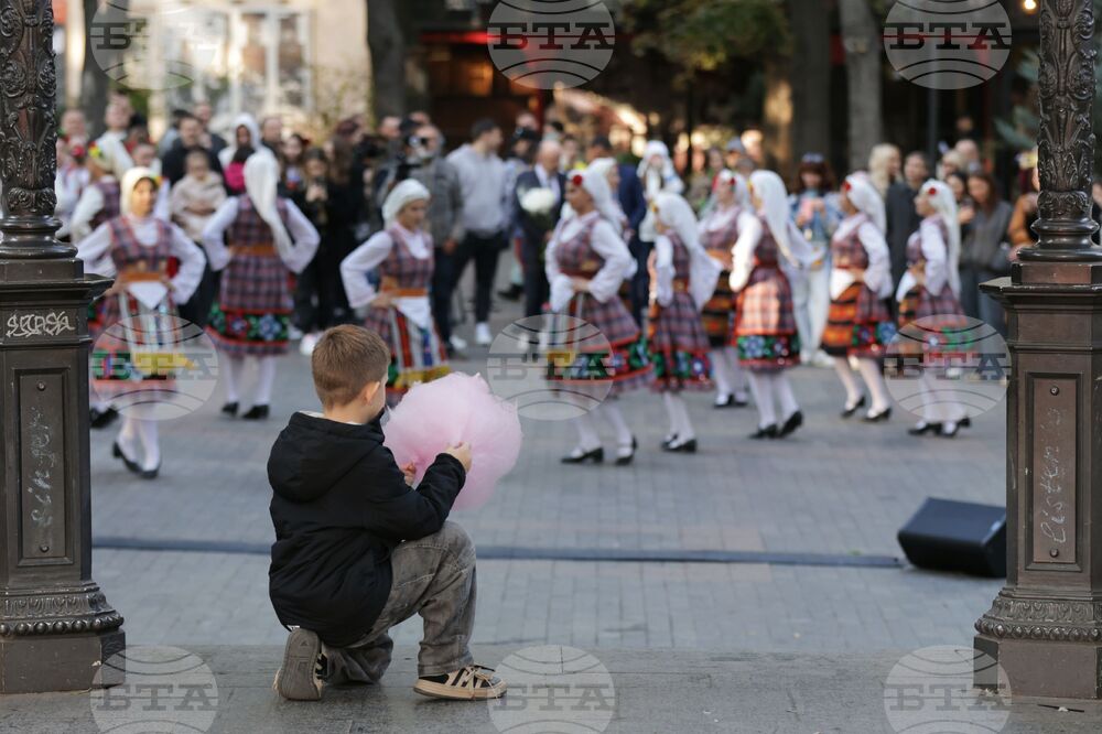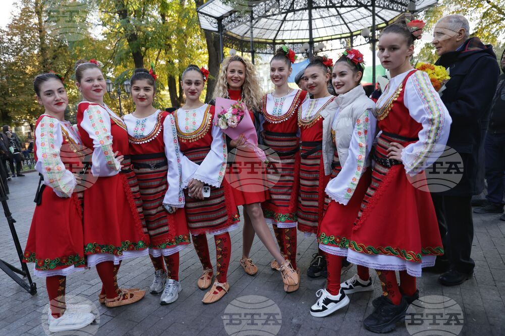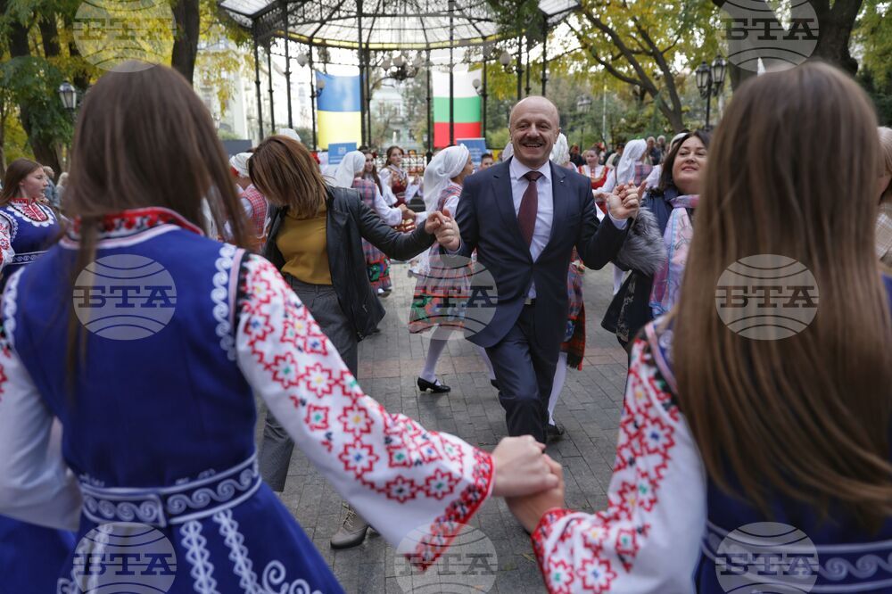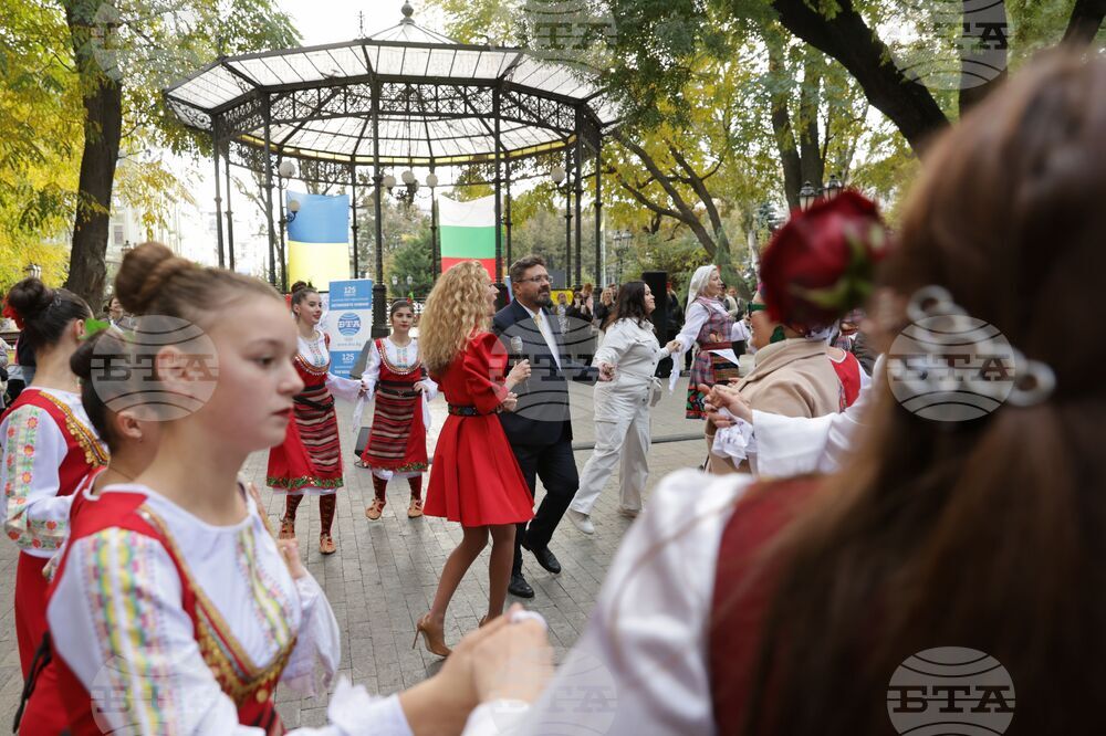 Одеса (26 октомври 2024) Генералното консулство на Република България в Одеса и Националният Пресклуб на Българската телеграфна агенция в Одеса организират празник за Деня на бесарабските българи - 29 октомври. При Ротондата на гpaдcкaтa гpaдuнa се провежда концерт на Деси Добрева и танцьорите от три български танцови състава от бесарабските села Камчик, Кулевча и Делжилер. На снимката: певицата Деси Добрева (в средата), Генералният директор на БТА Кирил Вълчев (вдясно).