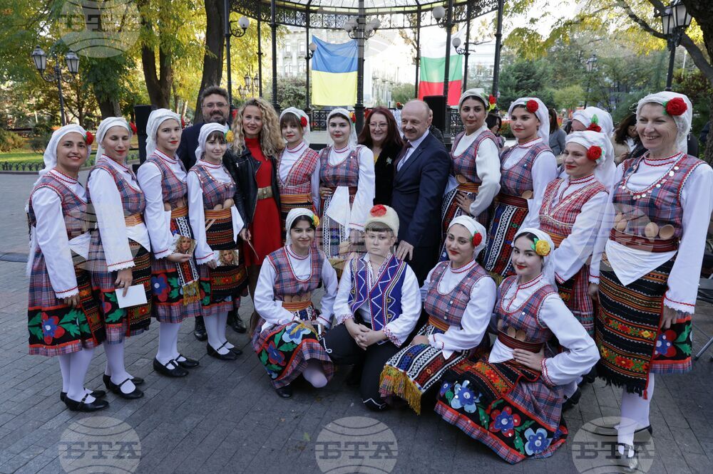 Одеса (26 октомври 2024) Генералното консулство на Република България в Одеса и Националният Пресклуб на Българската телеграфна агенция в Одеса организират празник за Деня на бесарабските българи - 29 октомври. При Ротондата на гpaдcкaтa гpaдuнa се провежда концерт на Деси Добрева и танцьорите от три български танцови състава от бесарабските села Камчик, Кулевча и Делжилер. На снимката присъстват: Генералният директор на БТА Кирил Вълчев, певицата Деси Добрева, Генералният консул на Република Бъгария в Oдеса Светослав Иванов и народен ансамбъл.