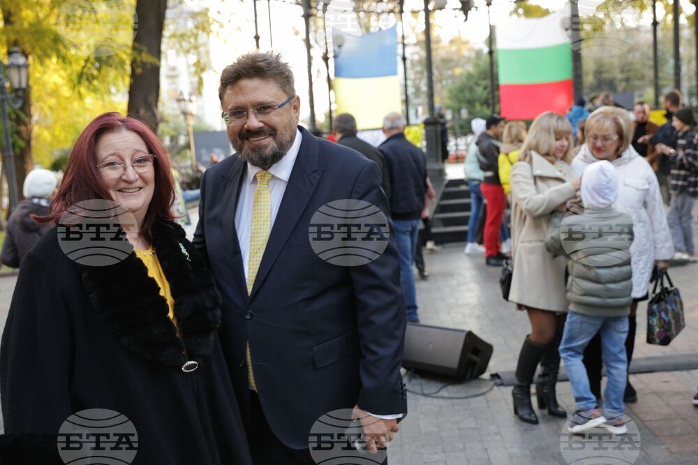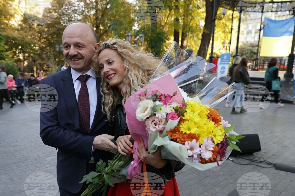Одеса (26 октомври 2024) Генералното консулство на Република България в Одеса и Националният Пресклуб на Българската телеграфна агенция в Одеса организират празник за Деня на бесарабските българи - 29 октомври. При Ротондата на гpaдcкaтa гpaдuнa се провежда концерт на Деси Добрева и танцьорите от три български танцови състава от бесарабските села Камчик, Кулевча и Делжилер. На снимката: Генералният консул на Република Бъгария в Oдеса Светослав Иванов (вляво), певицата Деси Добрева (вдясно).